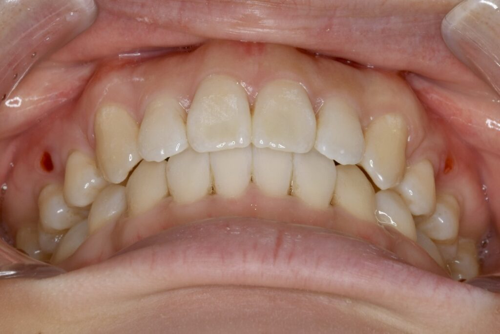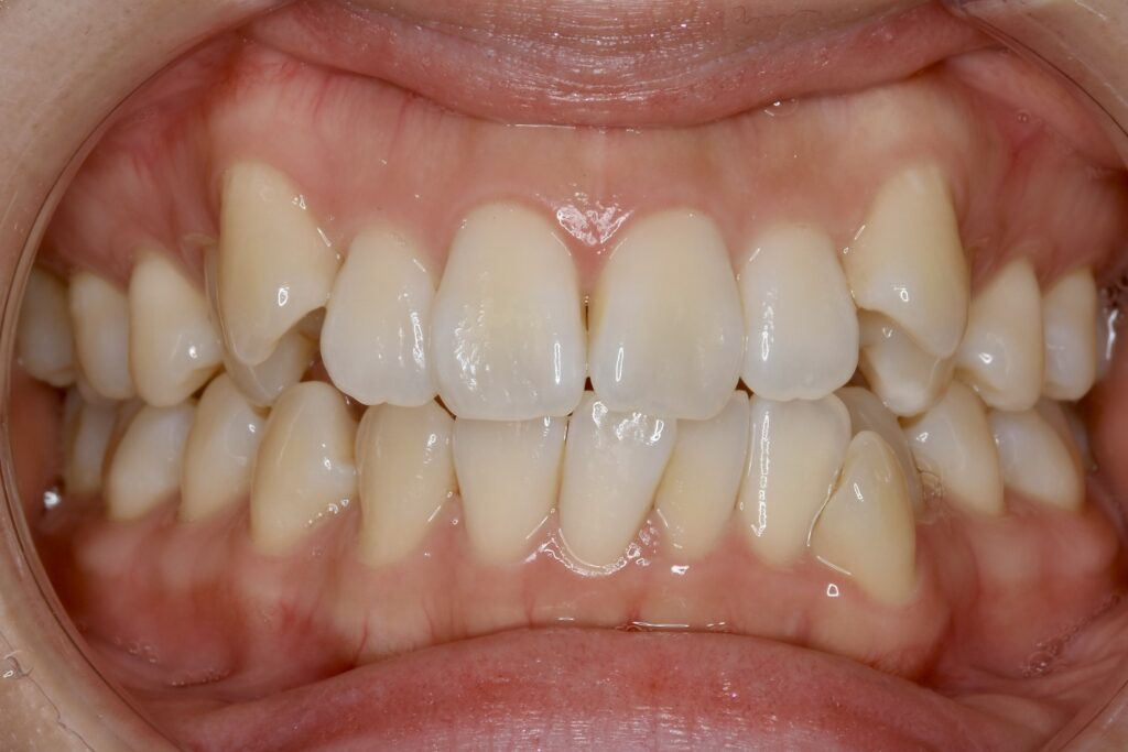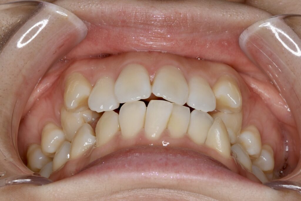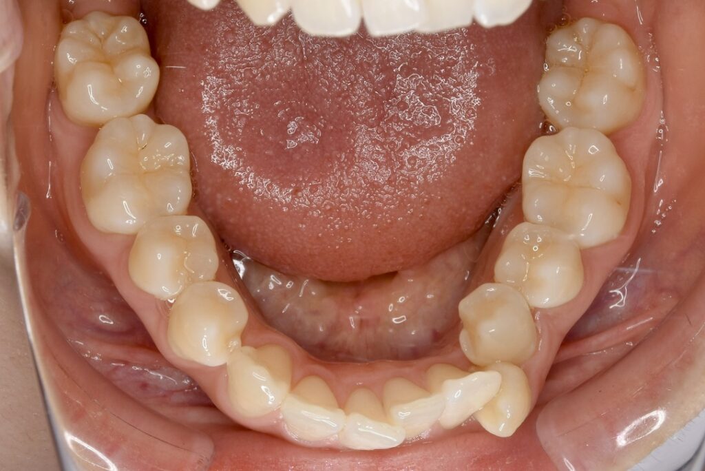 | 診断名・主な症状 | 下顎前歯の叢生を伴う過蓋咬合 |